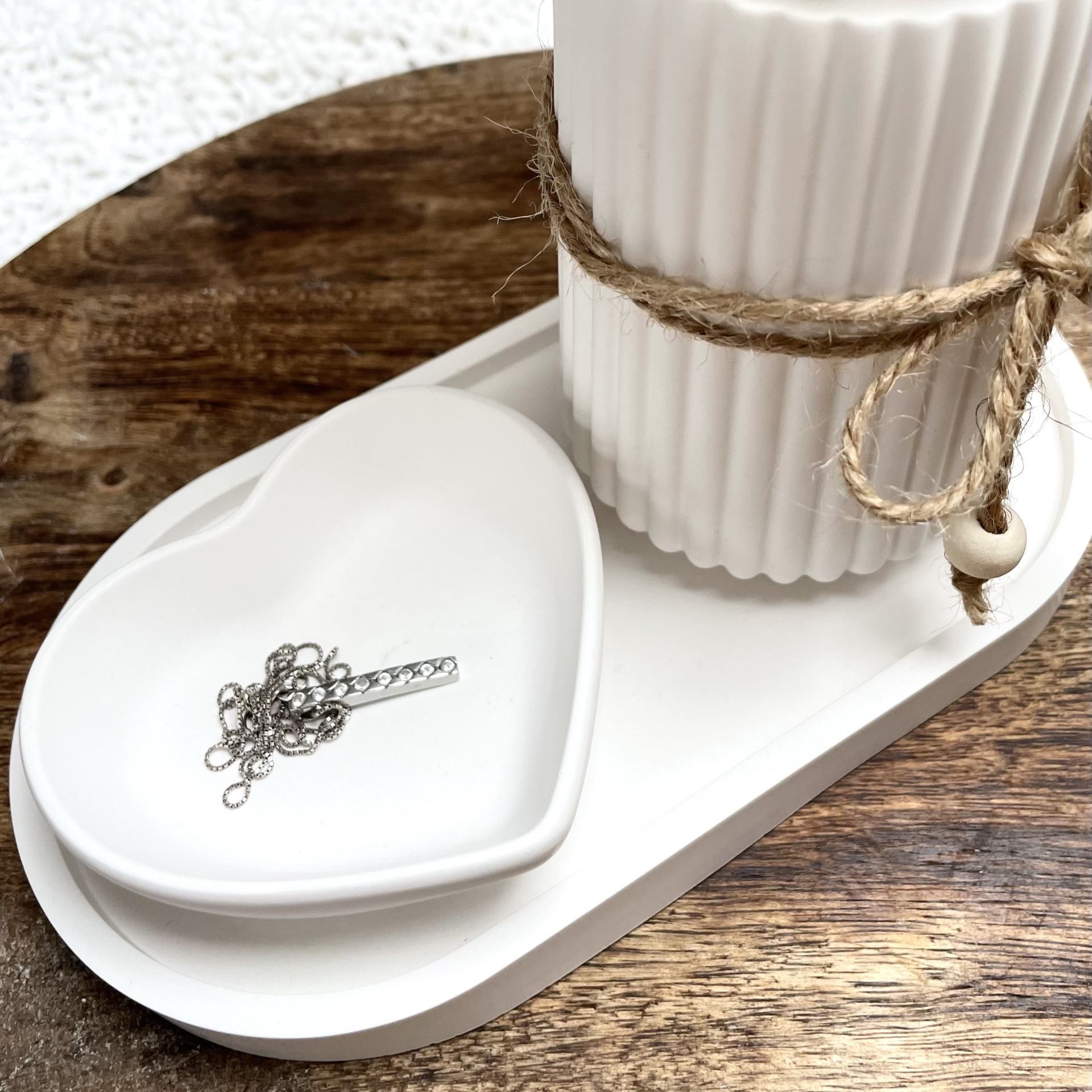 Elegantní, dekorativní třídílný set, který se skládá z tácku, vázičky a mističky ve tvaru srdíčka. Můžete jej využít na šperky, nebo jako samostatný dekorativní prvek, který vnese do vašeho domova hravost, jednoduchost a špetku elegance. Díky svému čistému bílému odstínu skvěle ladí s přírodními i minimalistickými interiéry.