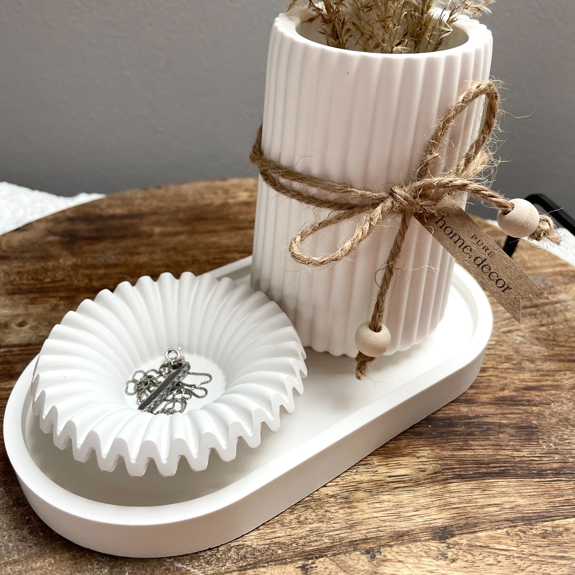 Elegantní, dekorativní třídílný set, který se skládá z tácku, vázičky a mističky. Můžete jej využít na šperky, nebo jako samostatný dekorativní prvek, který vnese do vašeho domova hravost, jednoduchost a špetku elegance. Díky svému čistému bílému odstínu skvěle ladí s přírodními i minimalistickými interiéry.