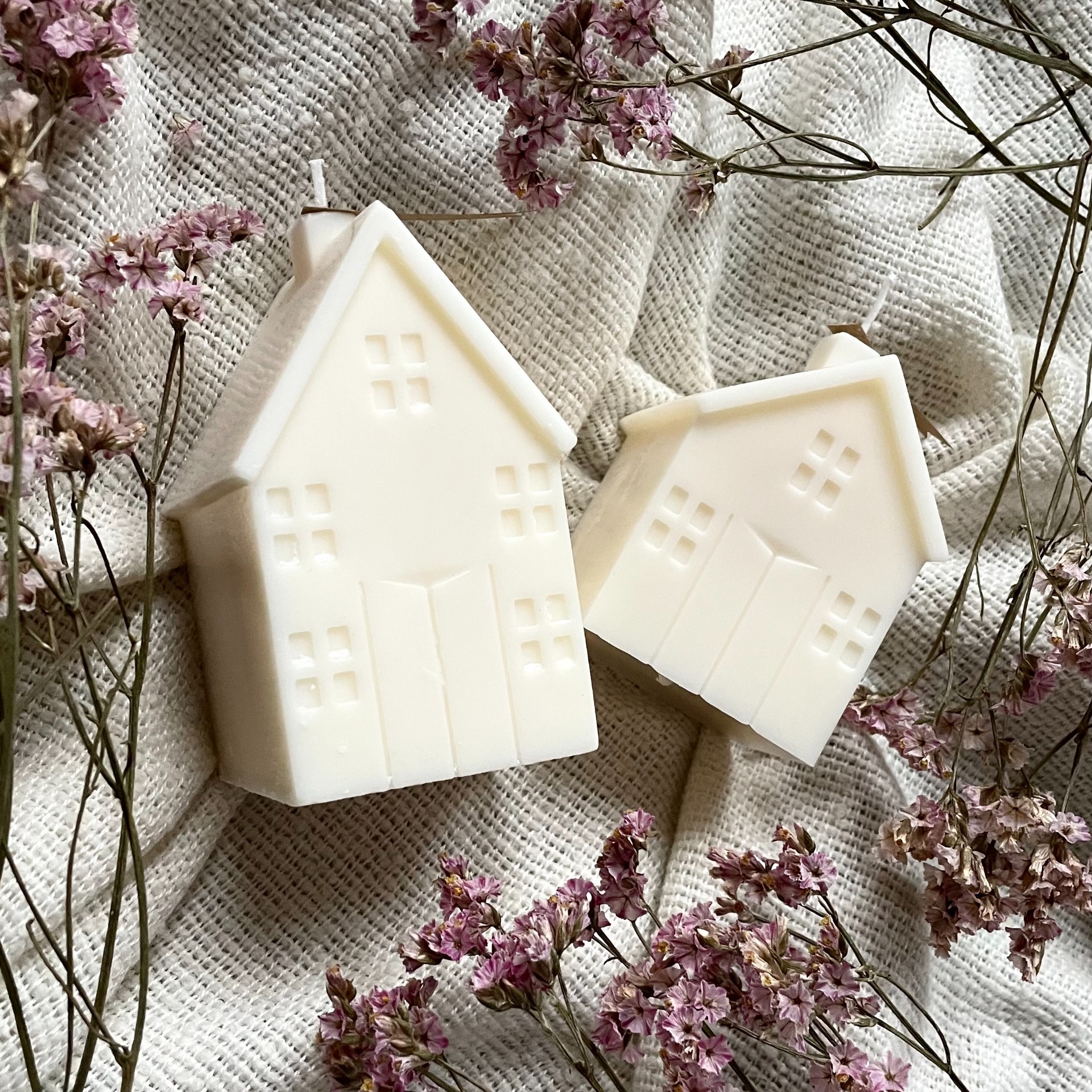 Sada dvou minimalistických svíček ve tvaru domečků. Dokonale doplní vaše jarní dekorace, nebo potěší jako drobný dárek.