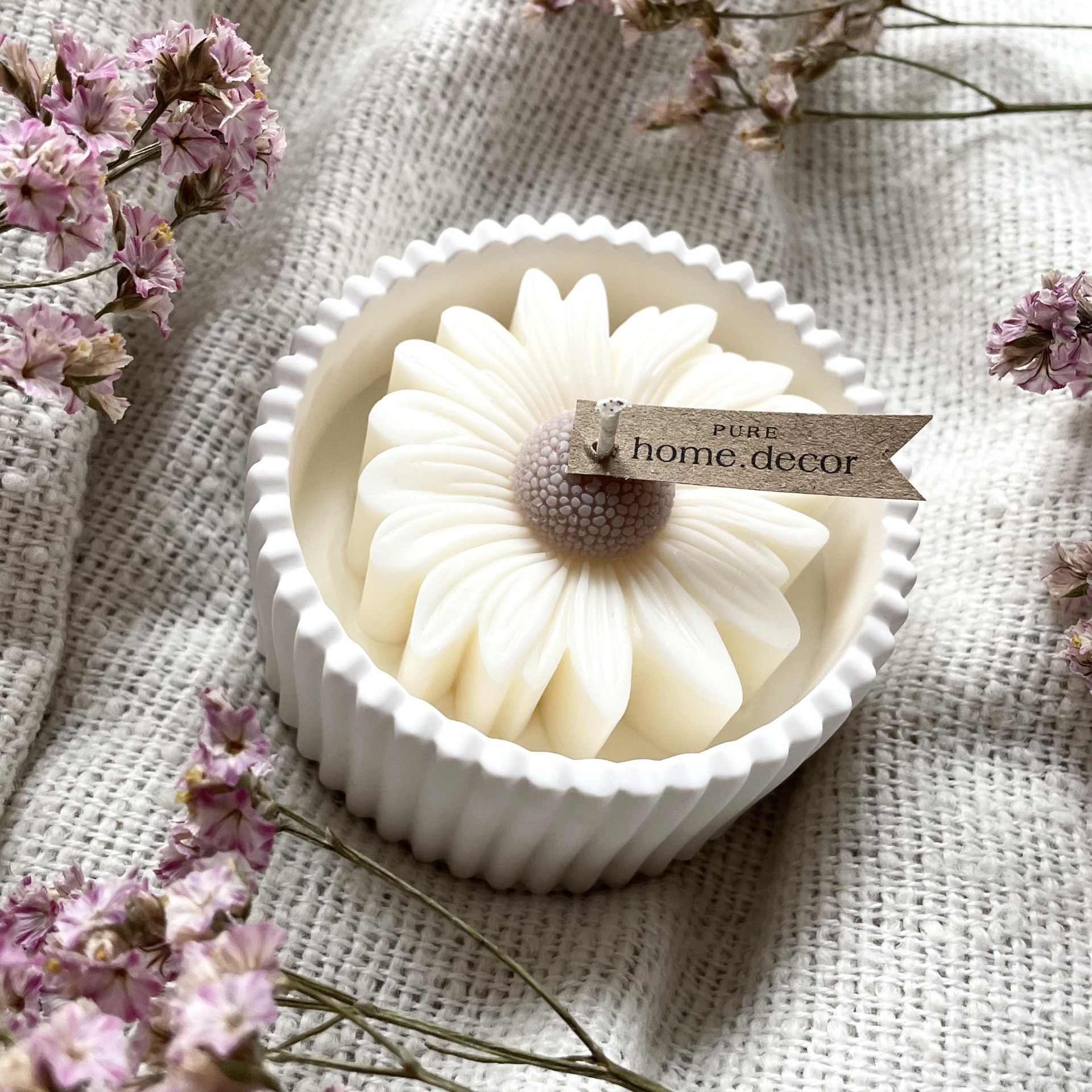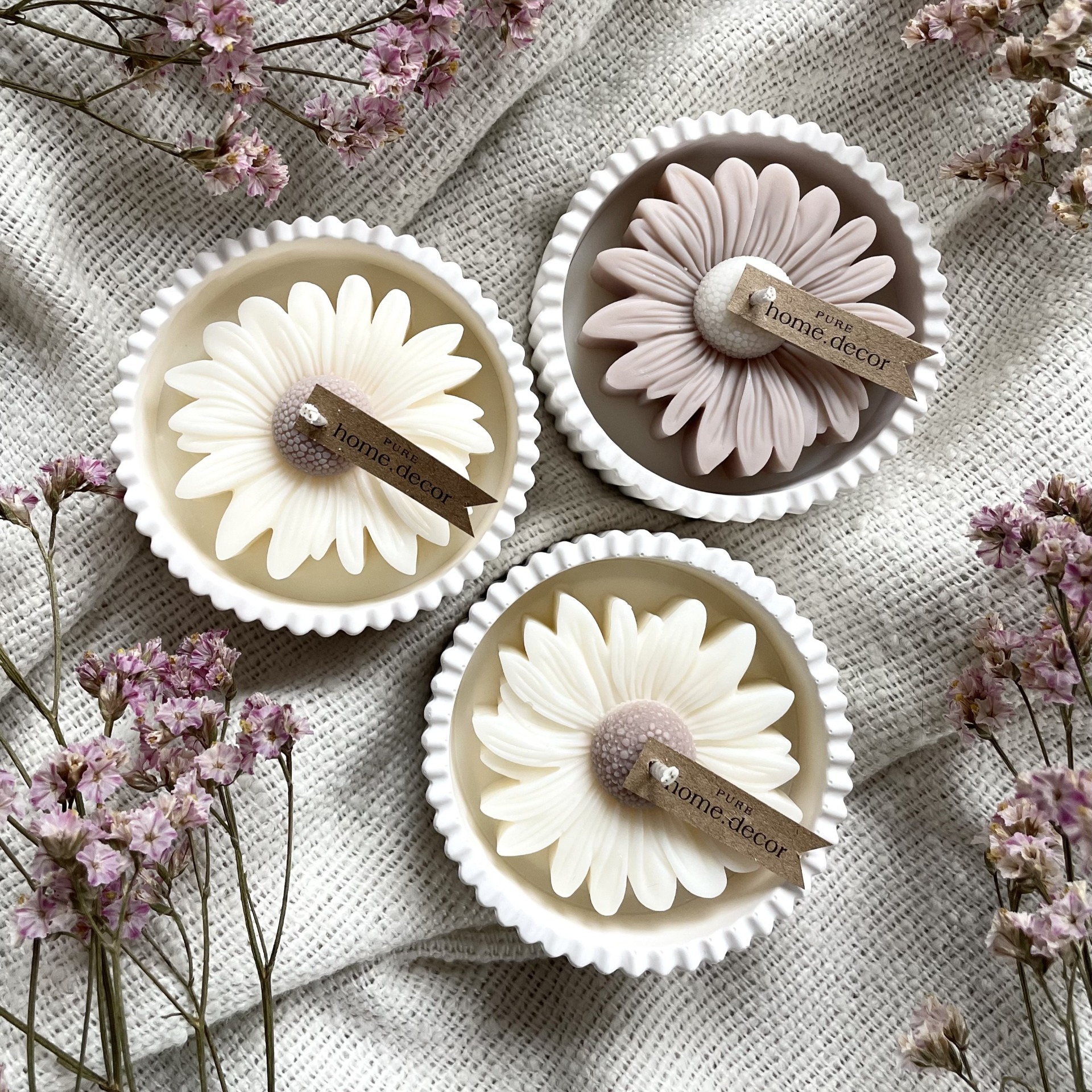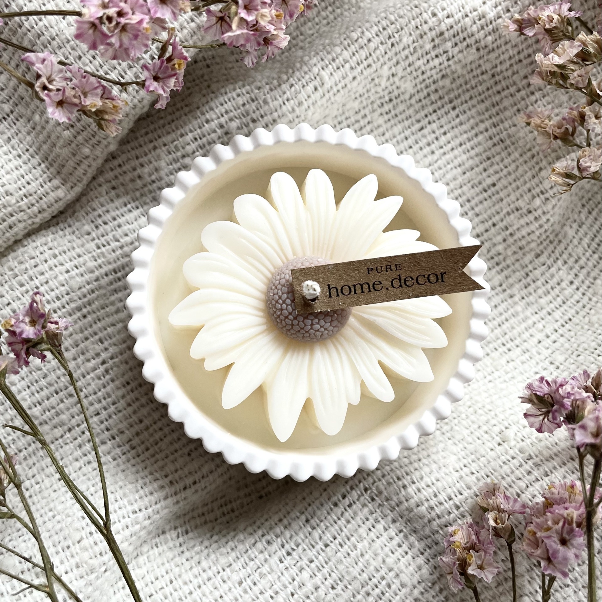 Jemná minimalistická svíčka v mističce z umělého kamene, ve tvaru kopretiny. Dokonale doplní vaše dekorace, nebo potěší jako drobný dárek.