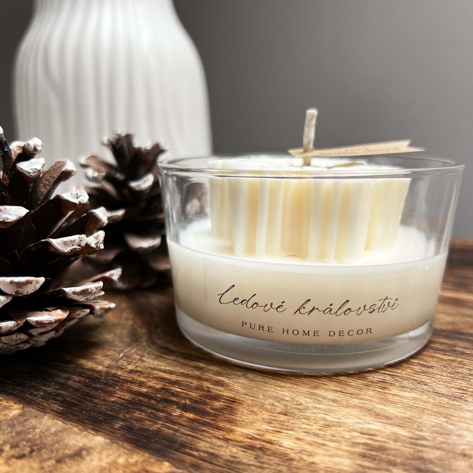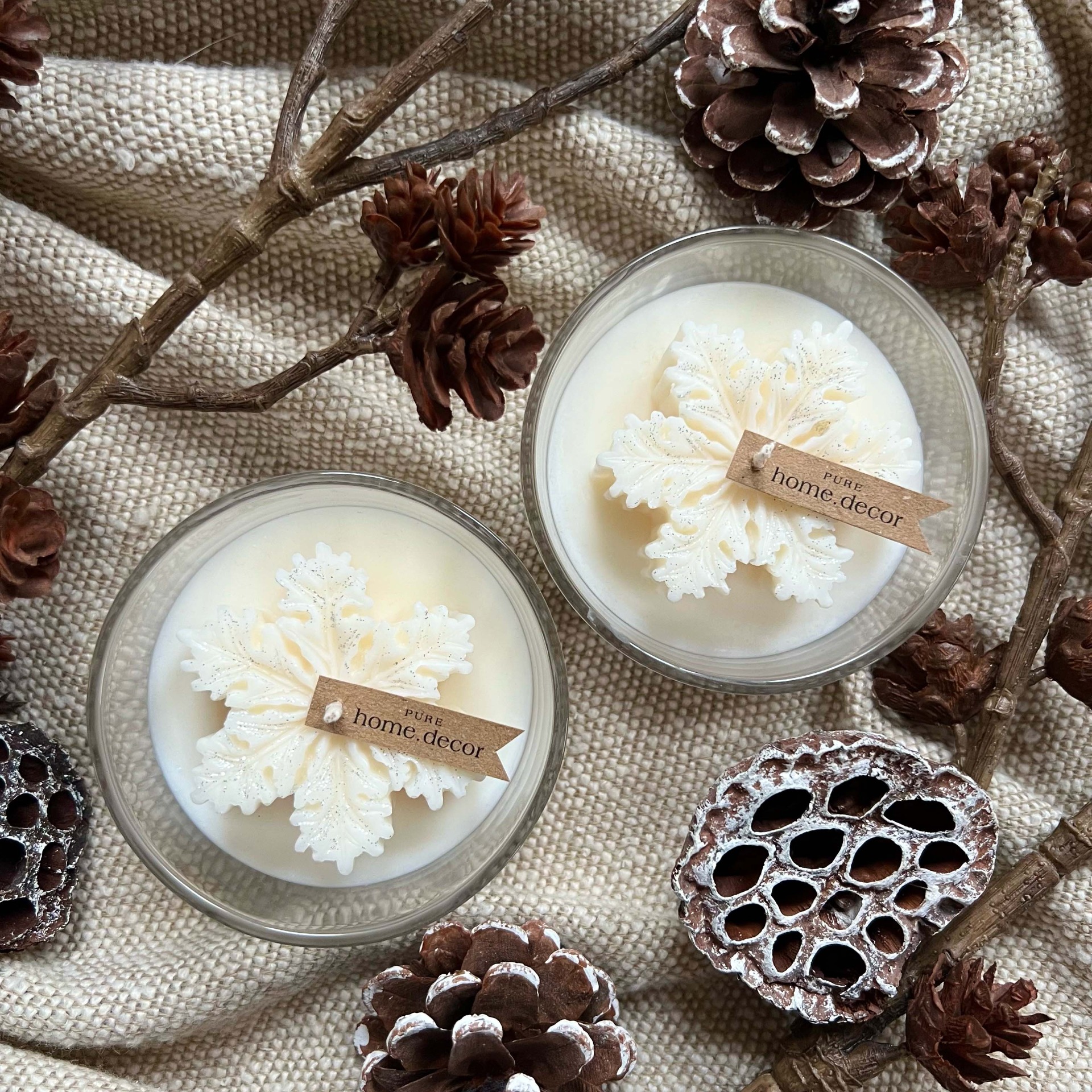 Jemná minimalistická svíčka ve skleněné dóze, ve tvaru vločky, která se na povrchu jemně třpytí. Dokonale doplní vaše vánoční dekorace, nebo potěší jako drobný dárek.