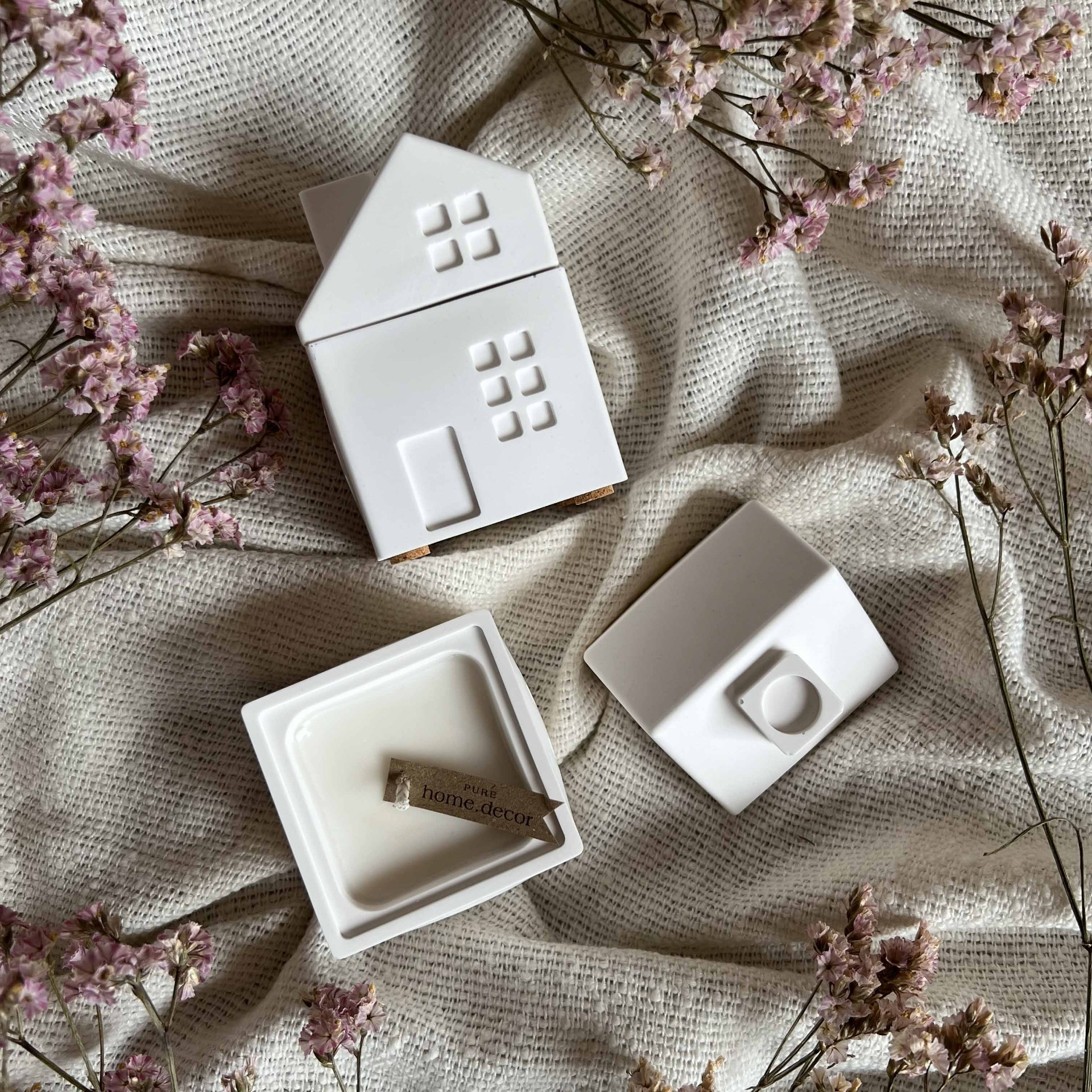 Jemná minimalistická svíčka z umělého kamene, ve tvaru domečku. Dokonale doplní vaše dekorace, nebo potěší jako drobný dárek.